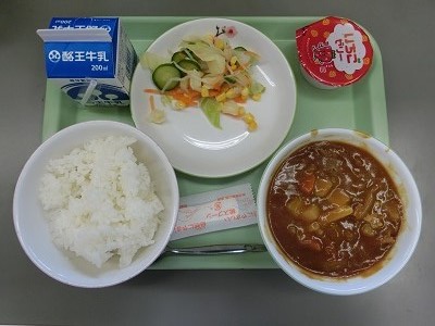 今日は、「入学・進級お祝い献立」でした。メニューは、ごはん、牛乳、ポークカレー、コーンサラダ、いちごゼリーでした。学校へ入学された皆さん、進級された皆さんおめでとうございます!!