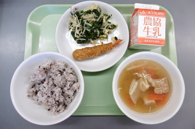 本日の給食は、6年生の卒業をお祝いする「卒業祝い献立」です。給食のメニューは、紫黒米ごはん、パックソース、牛乳、エビフライ、ちぐさあえ、沢煮椀でした。