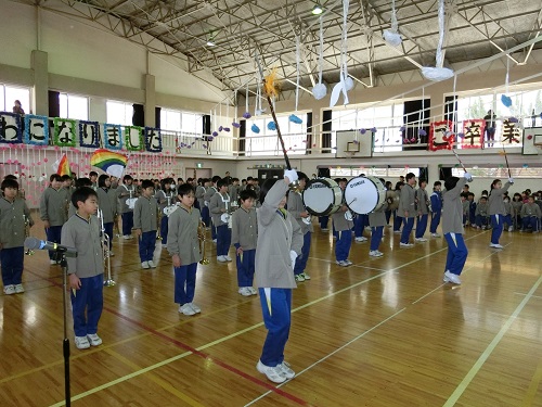 今日の3・4校時に体育館で「6年生を送る会」と「鼓笛隊移杖式」が行われました。きれいに飾られた会場で1~3年生とダンスクラブによる心のこもった発表が行われました。後半は、4~6年生による鼓笛隊移杖式、楽しい班対抗ゲーム、記念品贈呈、在校生からの歌のプレゼントが行われました。どの発表も本当にすばらしいものでした。また、最後には6年生からも歌と言葉をいただき、とても素晴らしい会になりました。6年生の皆さん、今まで本当にありがとうございました
