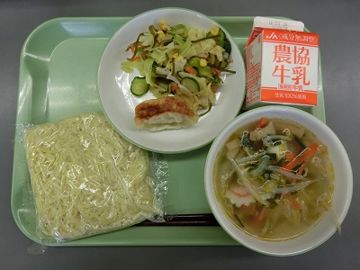 今日の給食は、「3月生まれのお誕生日お祝い献立」です。メニューは、中華ソフト麺、牛乳、餃子(1個)、りっちゃんサラダ、