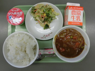 今日の給食は松陵中学校の3年生が考えた「松陵中リクエスト献立」です。メニューは、ごはん、牛乳、ポークカレー、コーンサラダ、ヨーグルトでした。