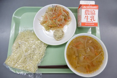 今日の給食のメニューは、牛乳、包子、はるさめサラダ、みそラーメンでした。
