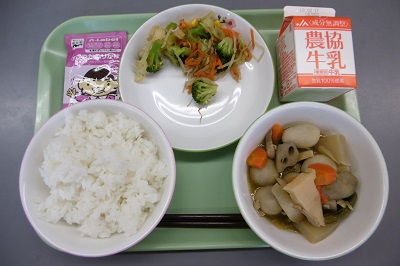 今日の給食は「福島を味わおう~白河市~」の献立でした。メニューは、ごはん、ふりかけ、牛乳、ブロッコリーおかかあえ、お煮しめでした。