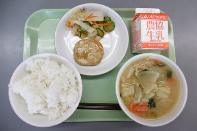 今日の給食は、明日から福島市で行われる暁まいりをイメージした給食で「信夫暁まいり献立」でした。メニューは、ごはん、牛乳、わらじつくね、ゆず入り白菜づけ、打ち豆汁でした。