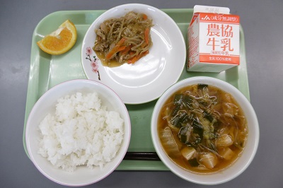 今日の給食は「オリンピック応援献立」です。メニューは、ごはん、牛乳、豚肉のプルコギ、キムチチゲスープ、いよかんでした。オリンピック真っ最中!みんなで応援しましょう!「がんばれ!日本!!」