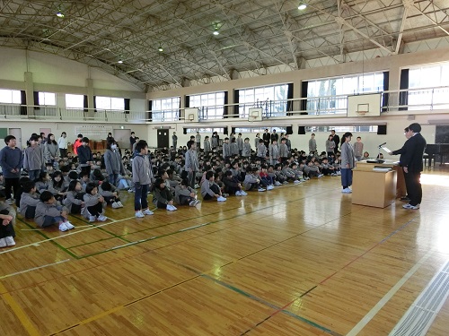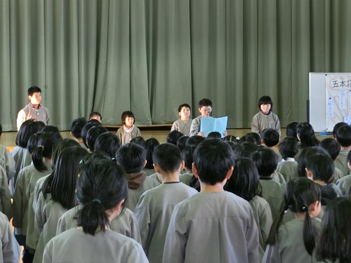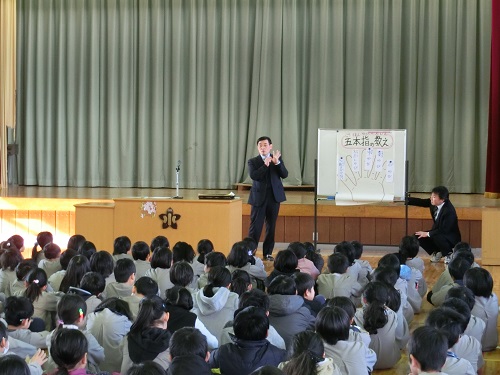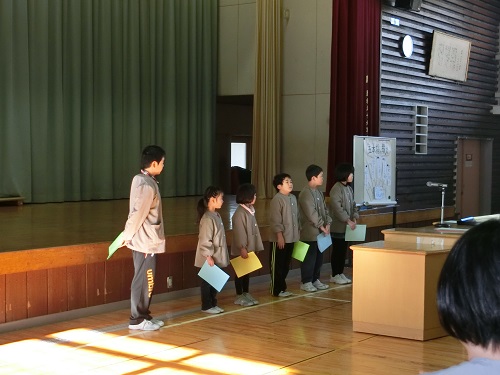 第2学期の終業式では、校長先生からこんな児童になってほしいという「5本指の教え」を聞きました。それぞれの指の意味についての話に、子どもたちも真剣に聞いていました。「2学期の反省と冬休みについて」の発表は各学年の代表児童が立派に発表しました。式の後には、各種コンクールの表彰が行われました。