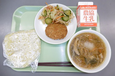 6日の給食は、かみかみ献立でした。メニューは、中華めん、牛乳、五目あんかけ汁、豆とかぼちゃのコロッケ、かみかみサラダでした。