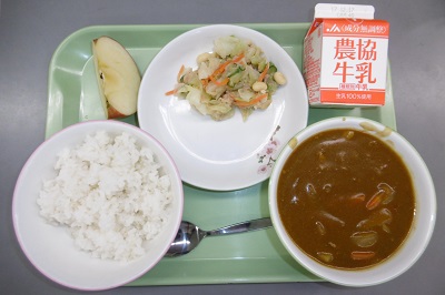 今日の給食は、麦ごはん、牛乳、ポークカレー、大豆とツナのサラダ、りんごでした。