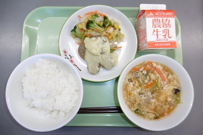 11日の給食献立は、「福島市110周年お祝い献立」の第1弾でした。メニューは、ごはん、牛乳、ゆきうさぎのホワイトソースがけ、グリーンサラダ、卵のスープでした。福島市をイメージしたメニューに驚きました。