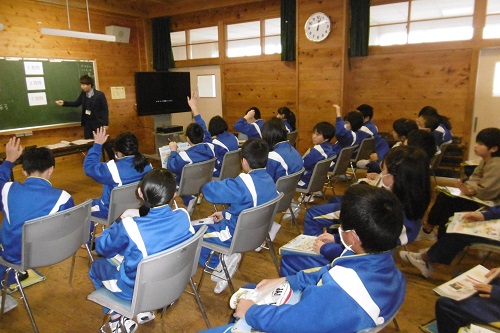 今日の3・4校時に、講師の先生を招いて、6年生を対象にした租税教室が行われました。税金のこと、税金がかかるものやかからないものについて、DVDを見ながら税金は必要かについてなどを学習しました。