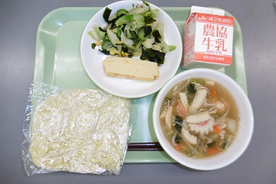今日の給食メニューは、中華めん、牛乳、厚焼きたまご、わかめ和え、チャンポンめんかけ汁でした。