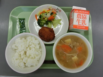 メニューは、ごはん、パックソース、牛乳、福島市産とり肉メンチカツ、ごんべ人参とブロッコリーのサラダ、きのこ汁でした。