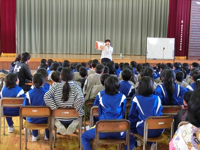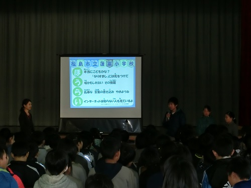 今日の3・4校時に1、2、3年生と保護者の皆様を対象にした、PTAによる教養講座が本校体育館で行われました。講師として、FTV(福島テレビ)のアナウンサー、浜中順子さんをお招きして、声の出し方について教えていただき、読み聞かせもしていただきました。テレビで見ているアナウンサーということもあり少しどきどきしながら、でも元気に楽しく話を聞く姿が見られました。