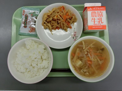 今日の給食メニューは、ごはん、くるみちりめん佃煮、牛乳、切り干し大根炒め煮、沢煮椀でした。