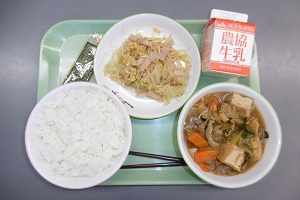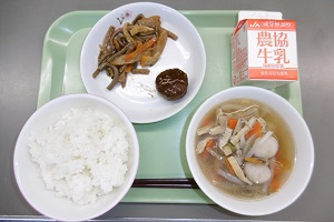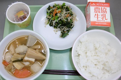 13日の給食メニューは、ごはん、納豆、牛乳、ピーナツあえ、吉野煮でした。