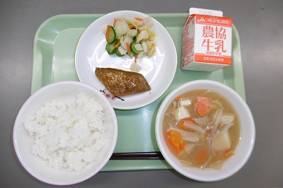 今日の給食は、和食献立でした。メニューは、ごはん、牛乳、さばのみそ煮、ゆず風味漬け、豚汁でした。