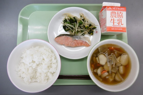 今日の給食は二本松市の郷土料理でした。メニューは、ごはん、牛乳、ますの塩焼き、菊花あえ、ざくざくでした。