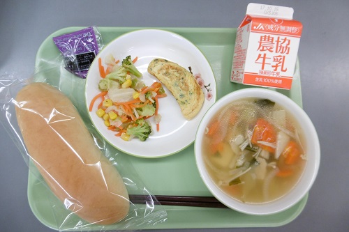 メニューは、コッペパン、ブルーベリージャム、牛乳、ほうれん草オムレツ、ブロッコリーサラダ、野菜スープでした。