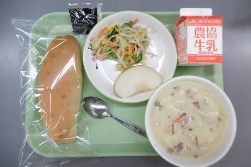 今日の給食メニューは、コッペパン、チョコレート、牛乳、ツナとコーンのサラダ、白いんげんのポタージュ、梨でした。