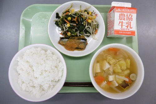 今日の給食メニューは、ごはん、牛乳、さんまの紅葉煮、おかかサラダ、さつま汁でした。秋の味覚を感じるメニューでした。