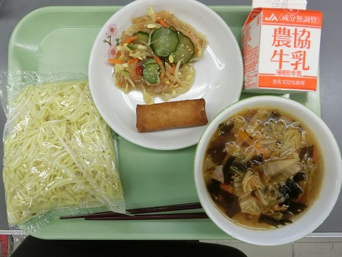 今日の給食メニューは、中華麺、牛乳、春巻き、ナムル、キムチラーメンスープでした。子どもたちがおかわりをするなど、たくさん食べている姿が見られました。