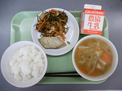今日は和食の日「お彼岸献立」でした。メニューは、ごはん、牛乳、ほっけの塩焼き、すき昆布の煮物、いもの子汁でした。