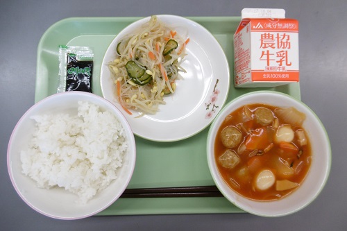 今日の給食メニューは、ごはん、のり佃煮、牛乳、春雨サラダ、肉団子と野菜の甘酢あんでした。