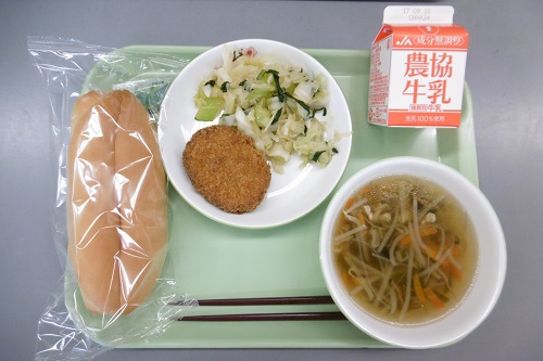 今日の給食は、切れ目コッペパン、パックソース、野菜コロッケ、ボイルキャベツ、茎わかめスープでした。切れ目コッペパンへ野菜コロッケをはさめて食べました。