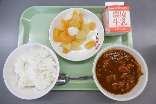 今日の給食はごはん、牛乳、杏仁フルーツ、ハヤシライスでした。