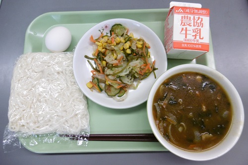 今日の給食は、蓬莱東小学校のお友達が考えてくれた、お誕生日お祝い献立でした。メニューは、ソフト麺、牛乳、味つきゆでたまご、りっちゃんサラダ、カレーうどん汁で、子どもたちの大好きな献立でした。9月生まれのみなさん、お誕生日おめでとうございます!