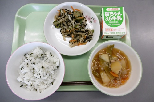 今日は、和食の日でした。給食のメニューはわかめごはん、牛乳、肉じゃが、しそひじきサラダでした。