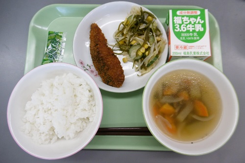 今日の給食メニューは、ごはん、パックソース、牛乳、さけフライ、わさびドレッシングサラダ、とうがんのスープでした。