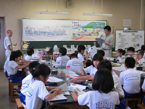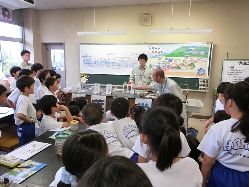 どのようにして水が家庭まで来るのか、また汚れた水がどうなってきれいになるのかについて話を聞き、班ごとに実験も行いました。子どもたちは、きれいになっていく水を見て驚いていました。