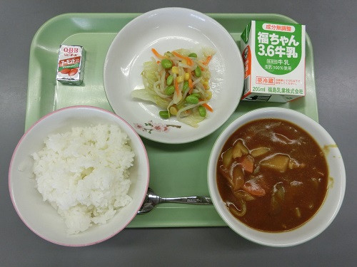 2017年7月18日 13時01分 今日の給食のメニューは、子どもたちの好きなポークカレー、ごはん、牛乳、アーモンドチーズ、枝豆サラダでした。喜んでいただきました。