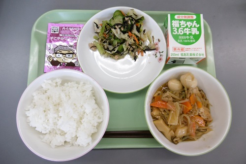 今日の給食メニューは、ごはん、おかかふりかけ、牛乳、ひじきサラダ、豚肉と野菜の中華いためでした。