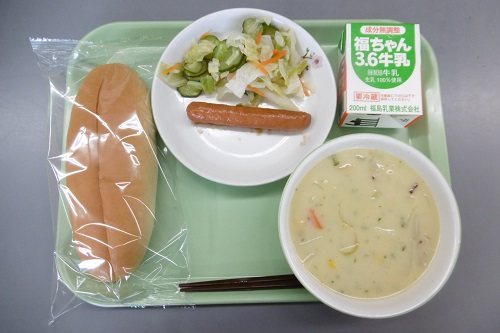 今日の給食メニューは、切れ目コッペパン、牛乳、フランクフルトケチャップソースかけ、コールスローサラダ、コーンクリームスープでした。児童の好きなメニューなので、喜んで食べました。
