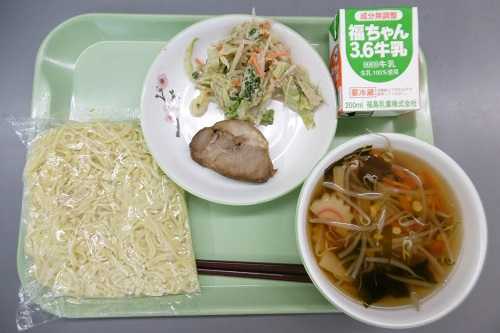 今日の給食メニューは、中華めん、牛乳、チャーシュー、シャキシャキサラダ、しょうゆラーメンスープでした。チャーシューは、ラーメンに入れてチャーシューめんにして、いただきました。