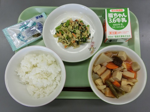 今日の給食メニューは、わかめごはん、牛乳、厚焼きたまご、ごまあえ、せんべい汁でした。せんべい汁は、青森県八戸周辺の郷土料理で、B級グルメとしても有名です。