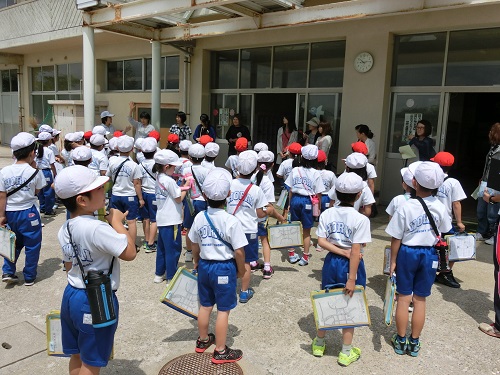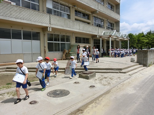 今日の3・4校時に2年生は生活科の学習で町探検へ出かけました。蓬莱駐在所など5つの場所を各班で分担して探検しました。また、各班には、保護者の皆さんにも着いていただき、無事に行ってくることができました。