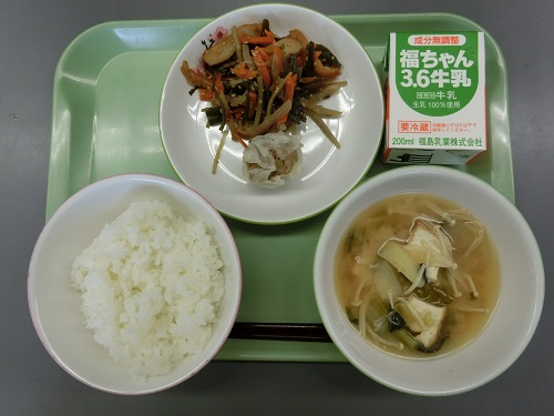 今日の給食は、和食の日「かみかみ献立」でした。メニューは、ごはん、牛乳、シュウマイ、茎わかめのきんぴら、生揚げと野菜のみそ汁でした。