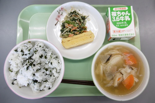 2017年6月26日 12時51分 今日の給食メニューは、わかめごはん、牛乳、厚焼きたまご、ごまあえ、せんべい汁でした。せんべい汁は、青森県八戸周辺の郷土料理で、B級グルメとしても有名です。