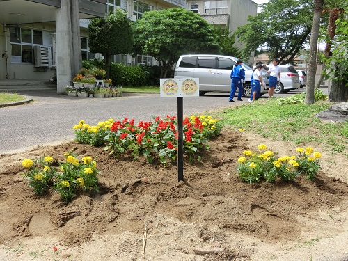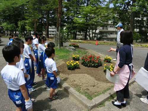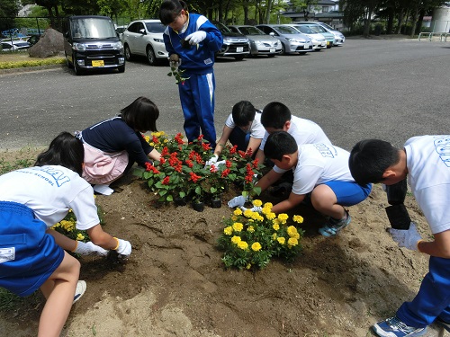 今日のお昼休み、人権擁護委員の方がいらっしゃって、環境委員の児童と一緒に花の苗を植えました。苗の植え方については、技能主査さんに詳しく教えていただき、スムーズにできました。花壇を花いっぱいにしようと進んで取り組む児童の姿が見られました。