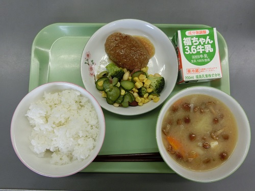今日の給食メニューは、ごはん、牛乳、ハンバーグのおろしソース、ビーンズサラダ、なめこのみそ汁でした。