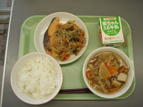 今日の給食は、和食の日「お魚献立」でした。メニューは、ごはん、牛乳、ますの塩焼き、もやしと挽肉の油いため、けんちん汁でした。