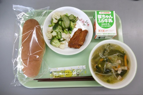 今日の給食のメニューは、コッペパン、りんごジャム、牛乳、県産キャベツメンチカツ、アスパラサラダ、ミネストローネスープでした。