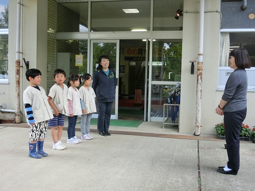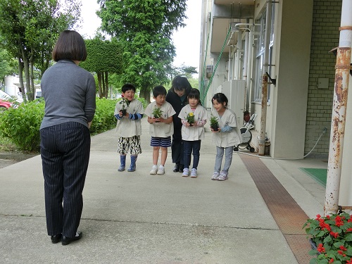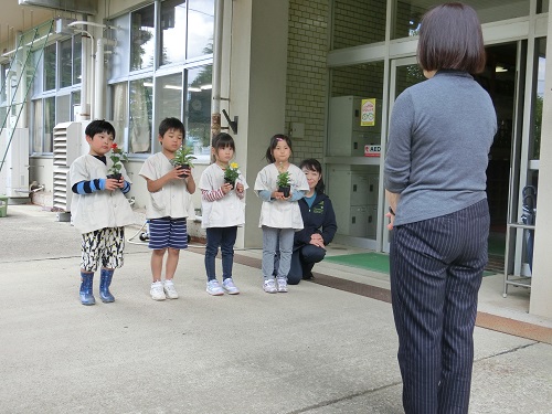 マリーゴールド、サルビア、千日紅の苗をいただいた4人のお友達は、とてもうれしそうでした。いただいた苗を、みんなで大切に育てたいと思います。
