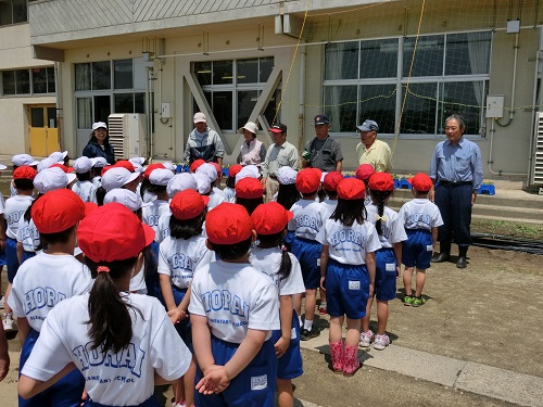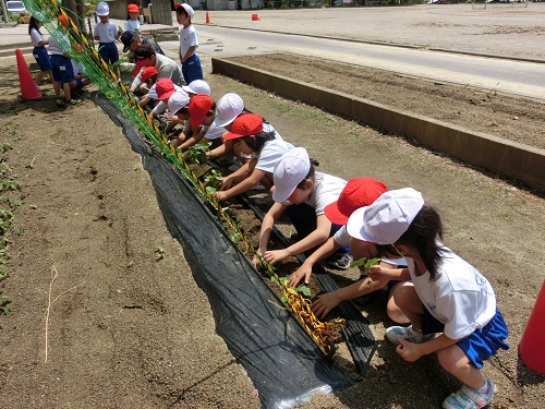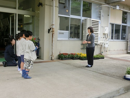 今日は、地域のなごみ会の方が来てくださり、1年生にあさがおのグリーンカーテン作りを教えてくださいました。1年生は話をよく聞き、あさがおを自分の鉢から植え替えました。とても上手にできました。
