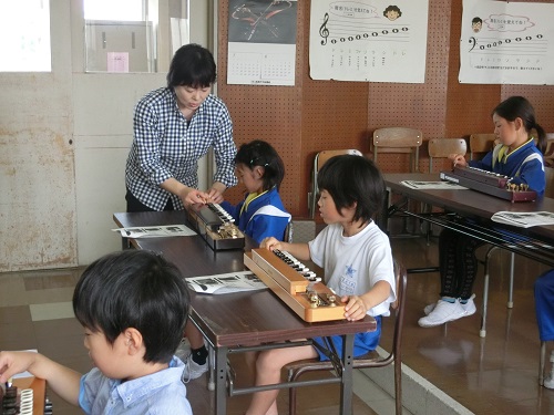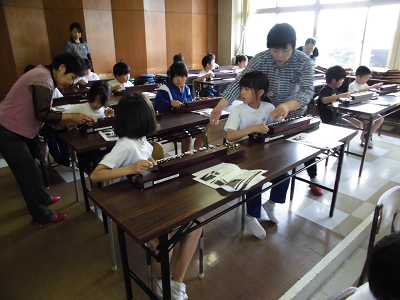 大正琴講習会。初めて触る楽器にドキドキの3年生。