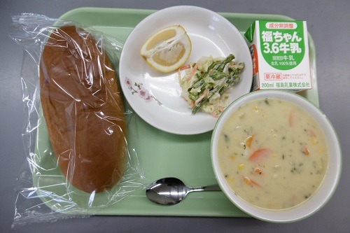 今日の給食メニューは、黒パン、牛乳、アスパラサラダ、コーンクリームスープ、果物(ニューサマーオレンジ)でした。