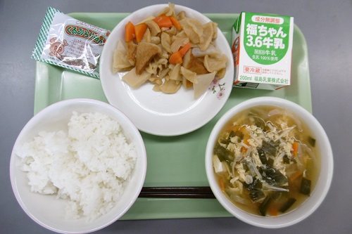 今日の給食メニューは、ごはん、牛乳、くるみちりめん、たけのこと凍み大根の煮物、にらたま汁でした。